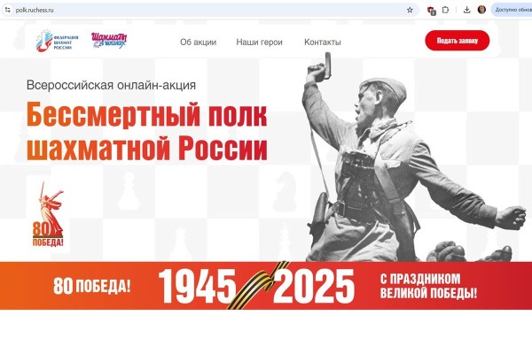Федерация шахмат России (ФШР) инициировала Всероссийскую онлайн-акцию под названием «Бессмертный полк шахматной России». Эта значимая инициатива реализуется в рамках специального проекта «Страна помогала шахматам, шахматы помогали стране». Одной из главных целей акции является сохранение бесценной исторической памяти о ветеранах и участниках Великой Отечественной войны, а также укрепление духовной связи между представителями разных поколений через призму шахматного сообщества.