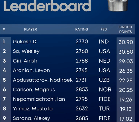 В апреле в рейтинге FIDE Circuit 2025 произошли значительные перемены. Как многие ожидали, Рамешбабу Праггнанандха обошел Дина Лижэня и занял первое место благодаря уверенному выступлению на турнире GCT Superbet Rapid & Blitz Poland. В этом соревновании Праггнанандха финишировал третьим и набрал 8.44 очка Circuit.