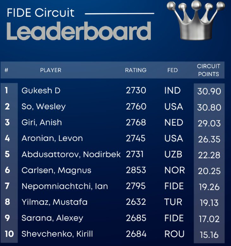 Сразу за пределами первой десятки находятся Нодирбек Абдусатторов и Ян Непомнящий. Оба шахматиста пока сыграли лишь по одному турниру, результаты которого учитываются в зачет FIDE Circuit.